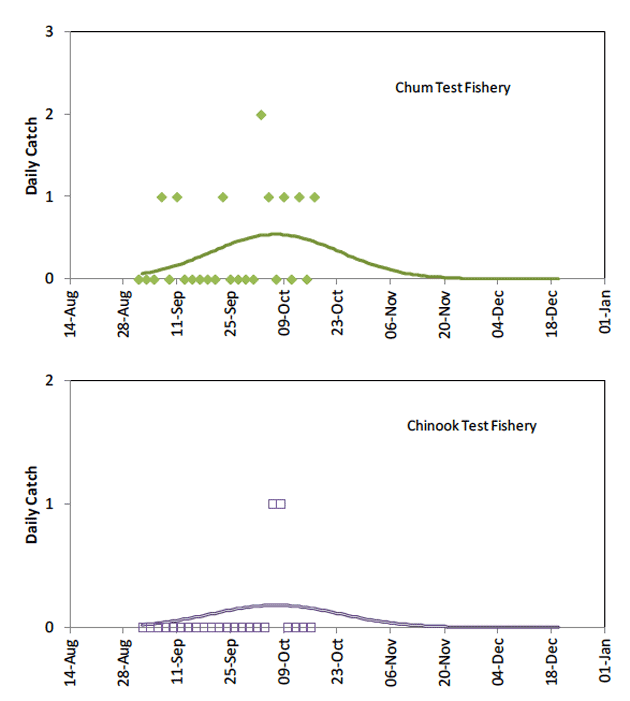 Figure 1. Observed catches of steelhead in the Albion chum and chinook test fisheries to date, illustrated by the diamonds and squares, respectively. The lines illustrate the "average" pattern expected for the balance of the season, given the observed catches to date, the historical data on run timing and the historical data on the efficiency of the two gillnets.